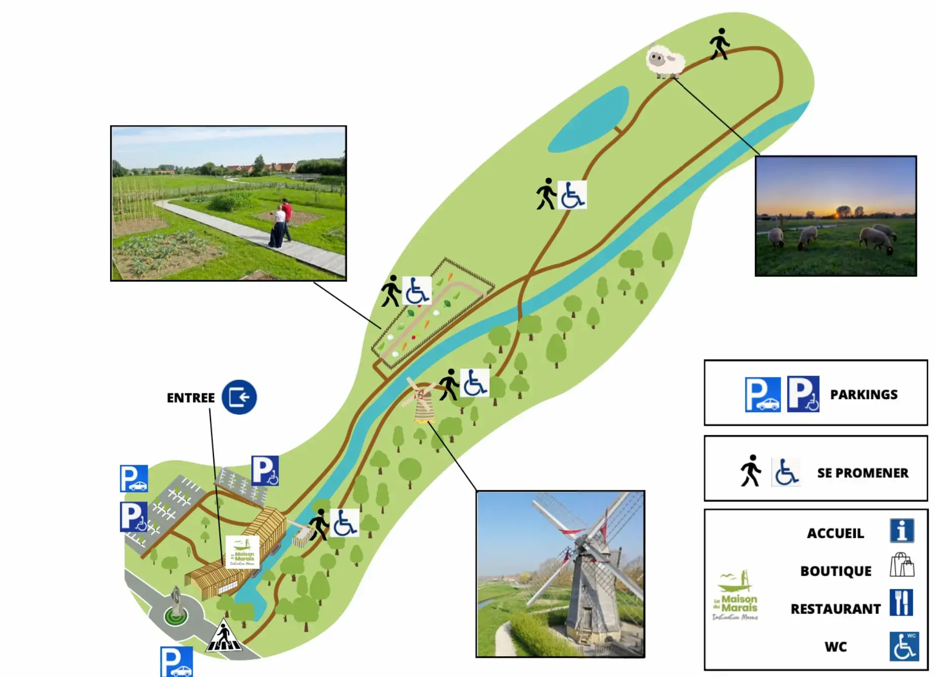To prepare your stay, consult the simplified map of the Maison du Marais: toilets, PRM car parks as well as walks and suitable places.
